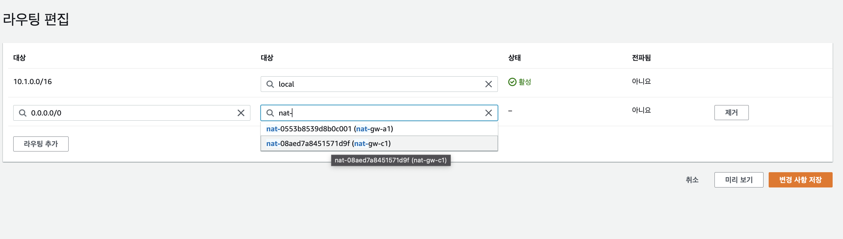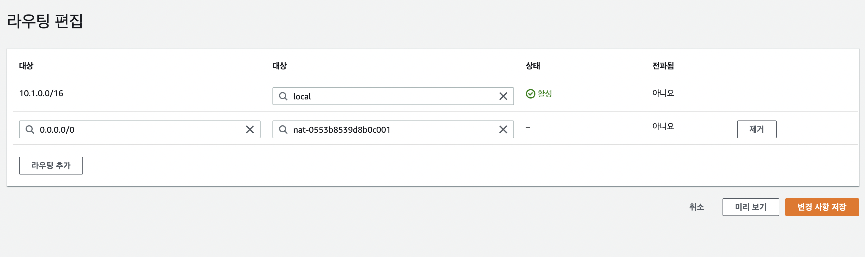 - Route table에 NAT gateway를 경로에 추가한다.
