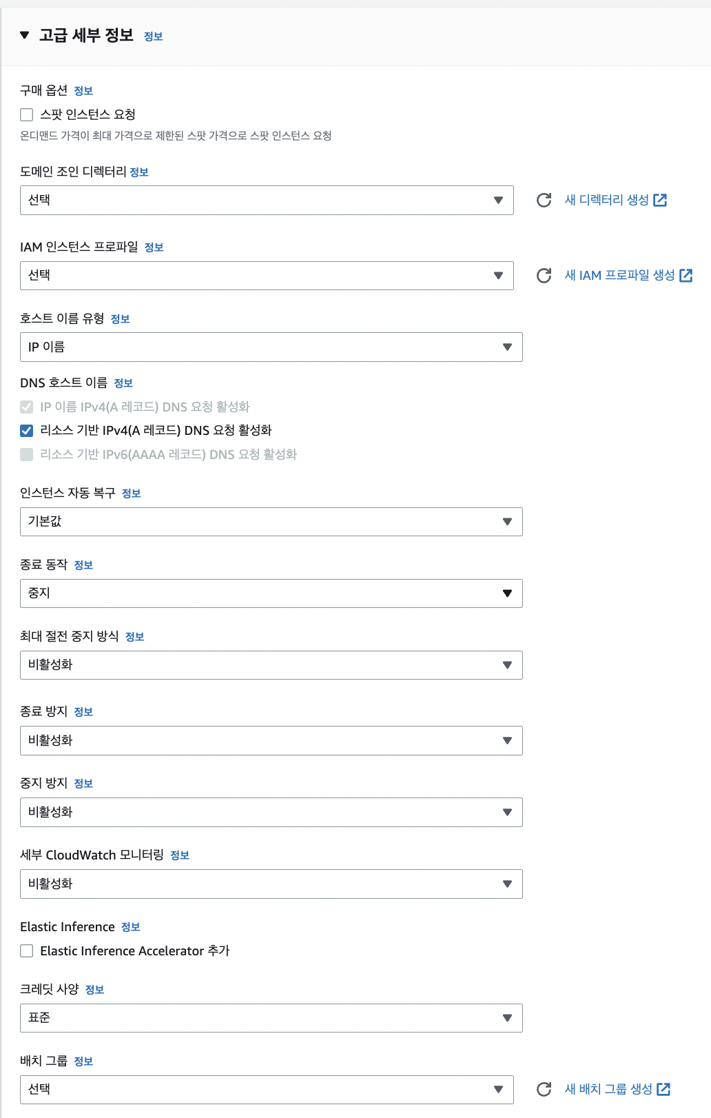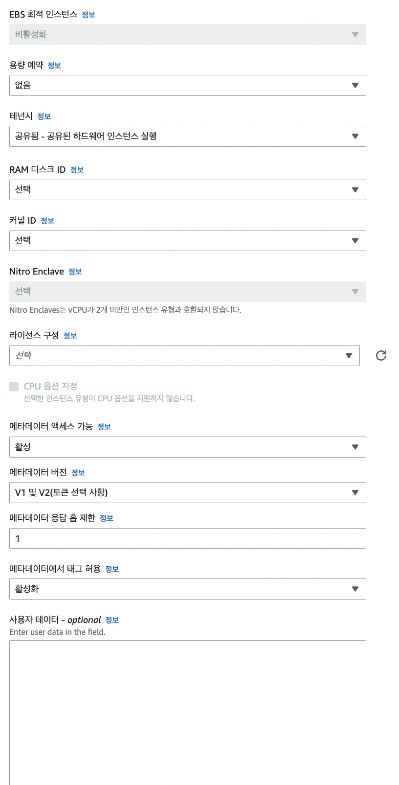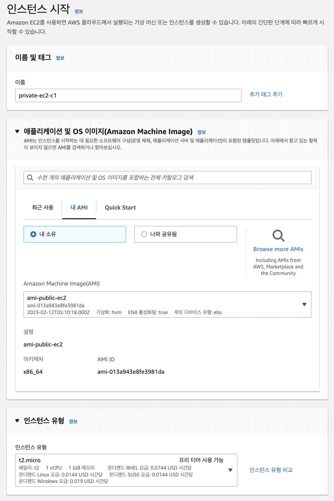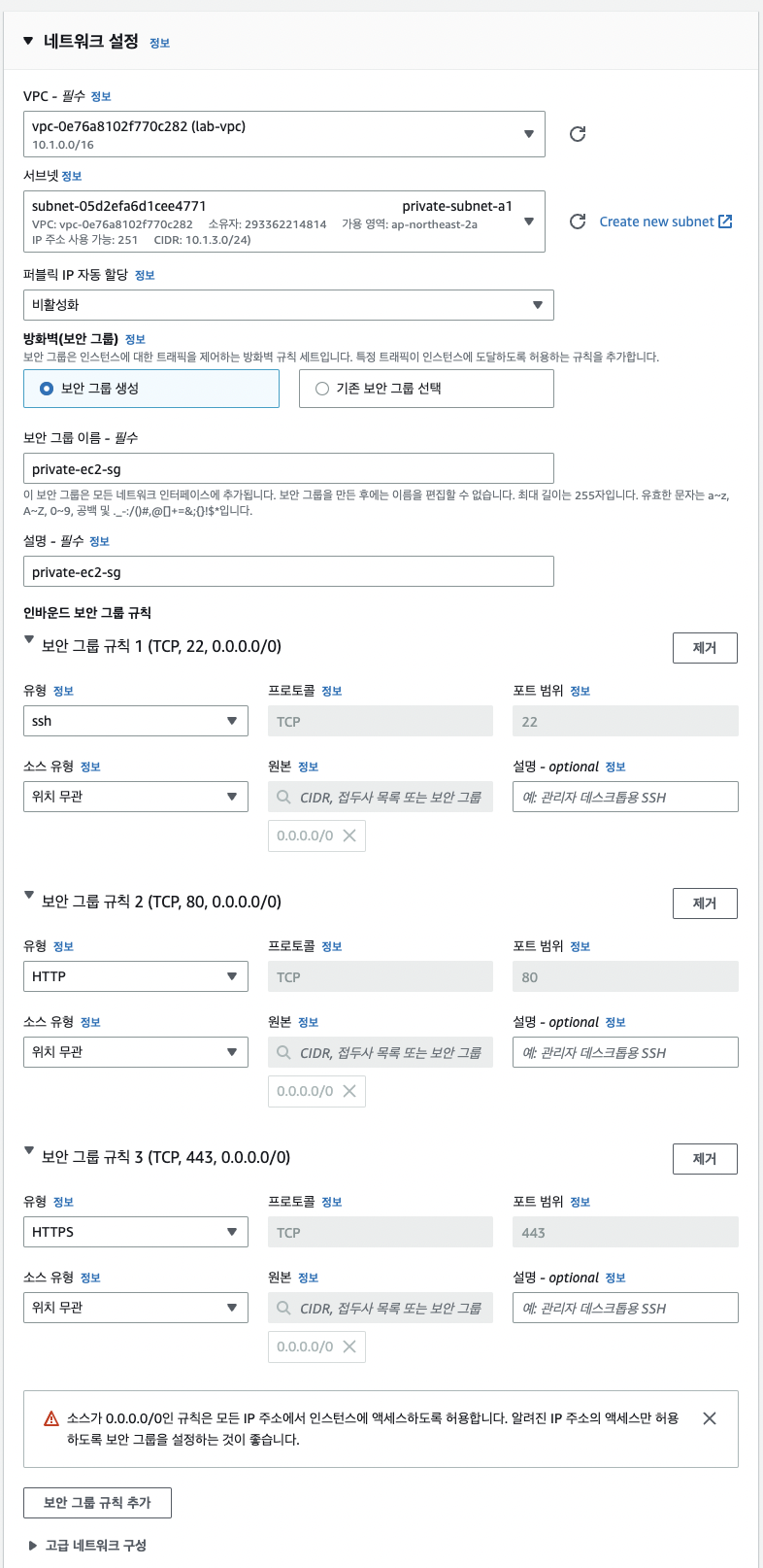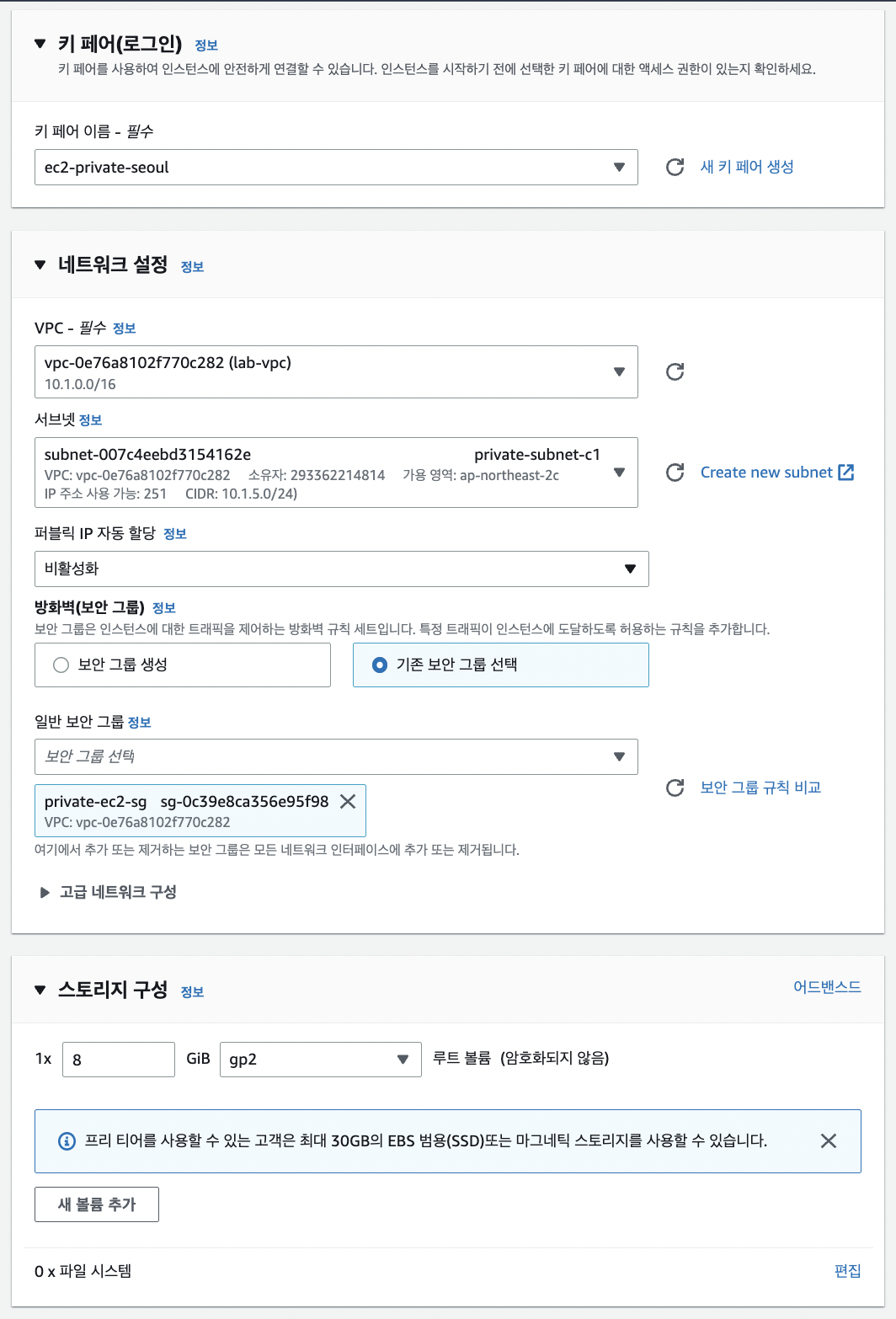 - 나머지는 이전 public ec2 만들 때와 동일한 옵션으로 생성한다.