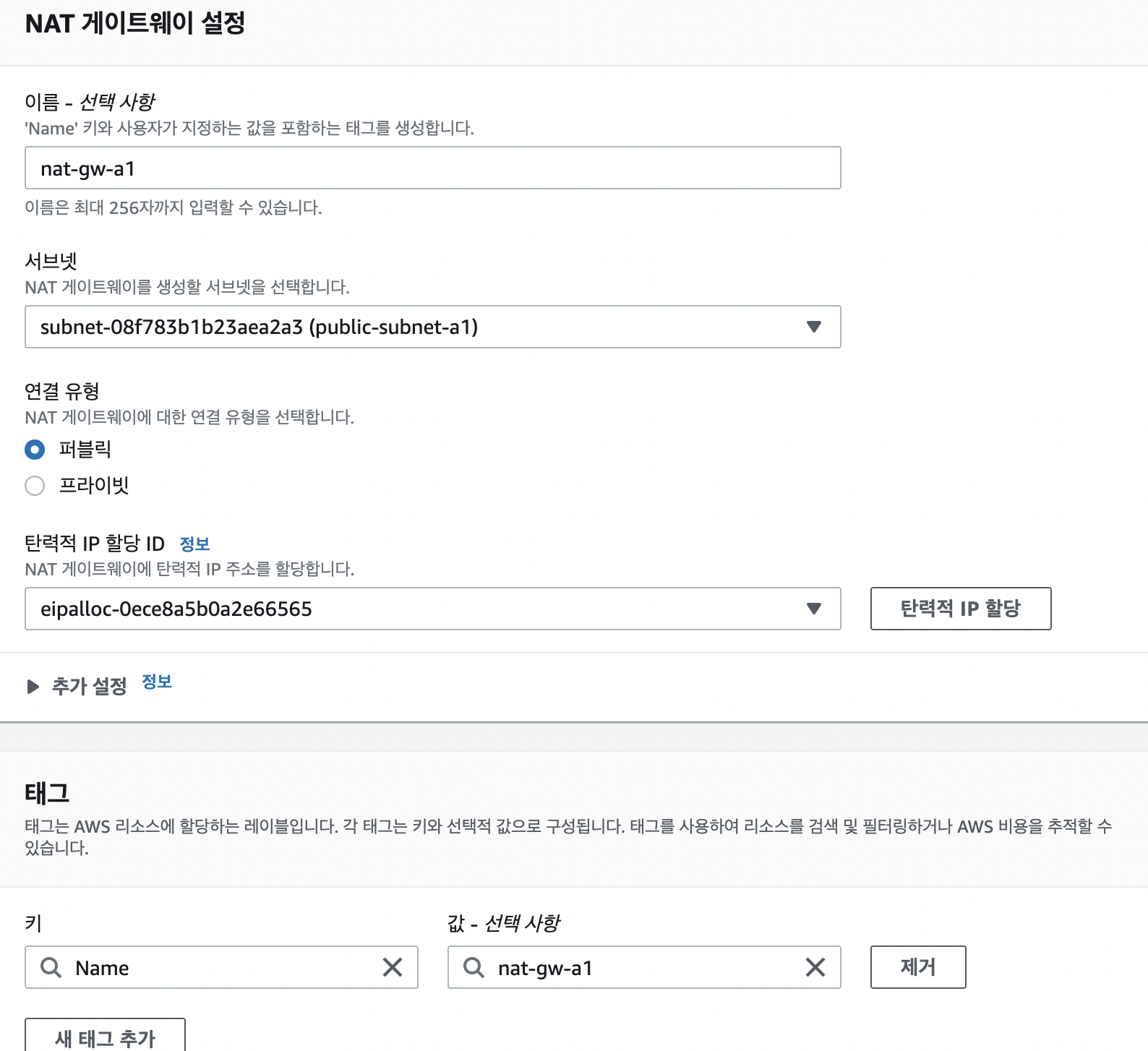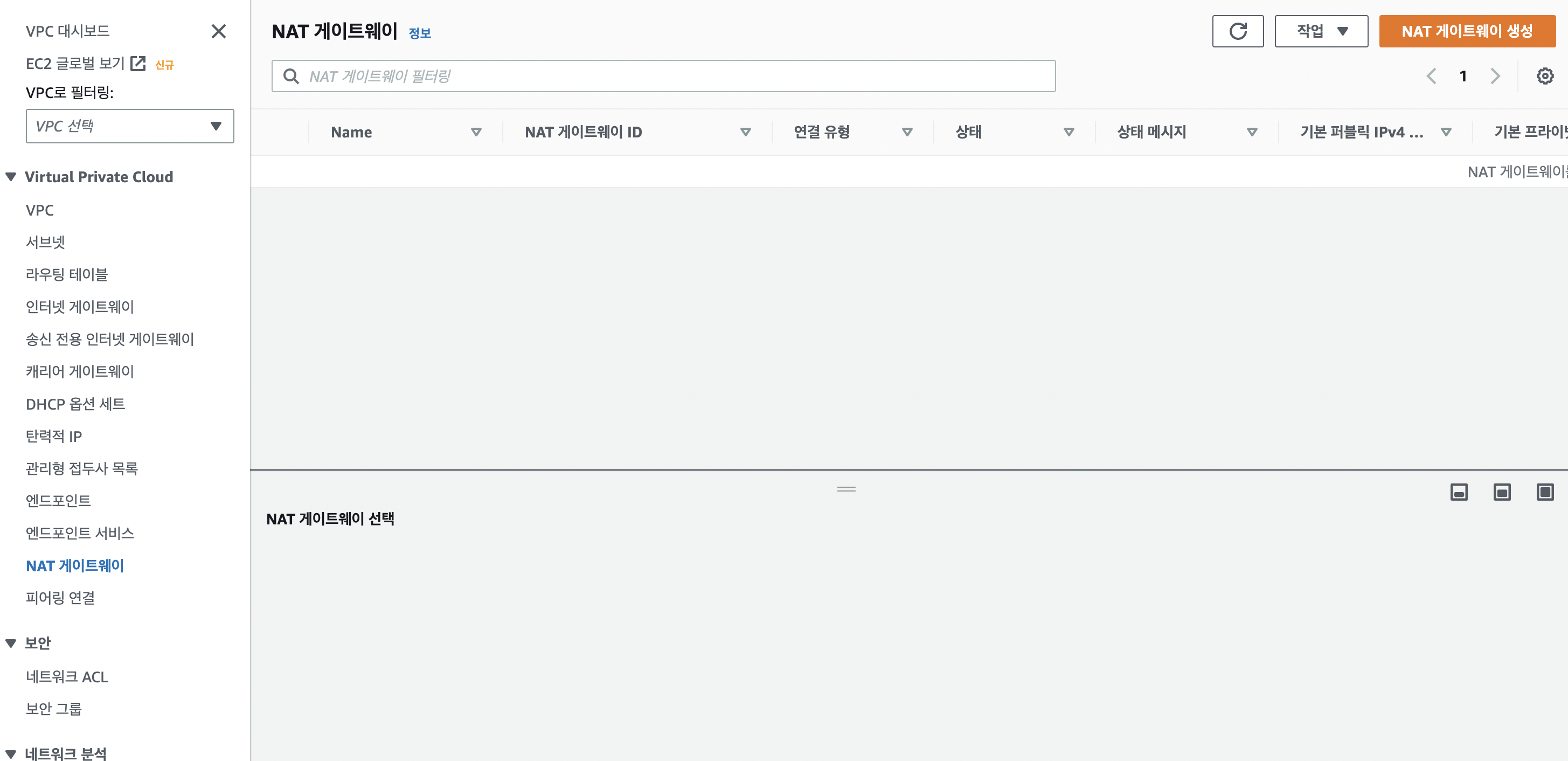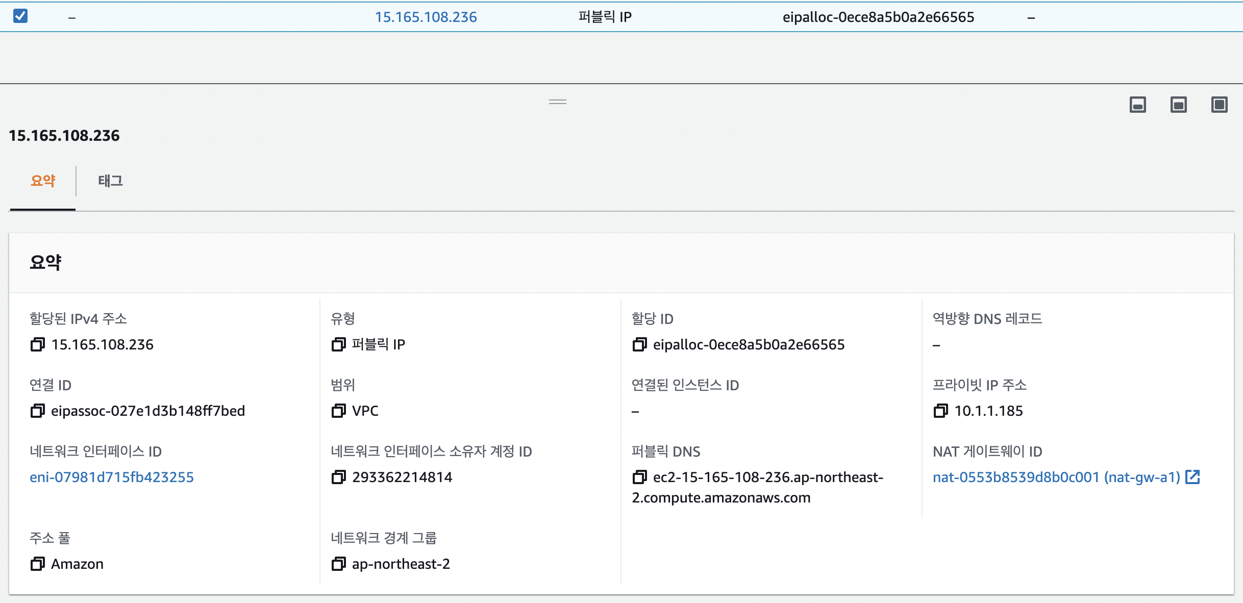 - 특히 외부 인터넷과 통신하기 위해서는 public ip를 가져야 하는데 이를 위해 elastic ip를 통해 NAT gateway에 ip를 할당하게 해주는 메뉴이다.