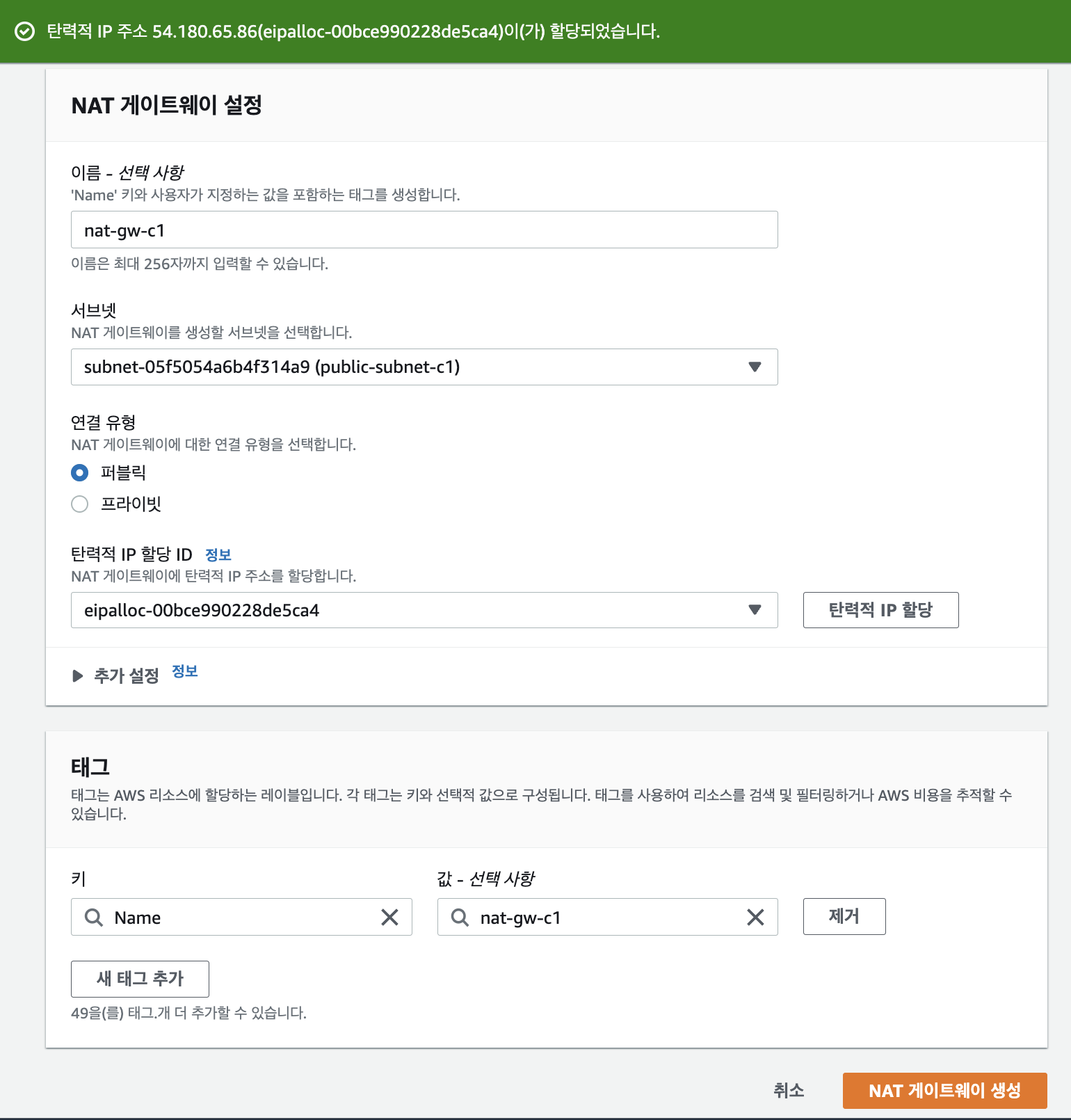- public-subnet-c1에 NAT gateway를 생성하고 private-ec2-c1이 외부와 통신할 수 있는 환경을 구축해본다.