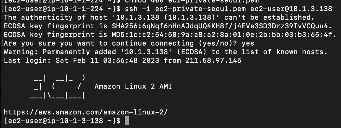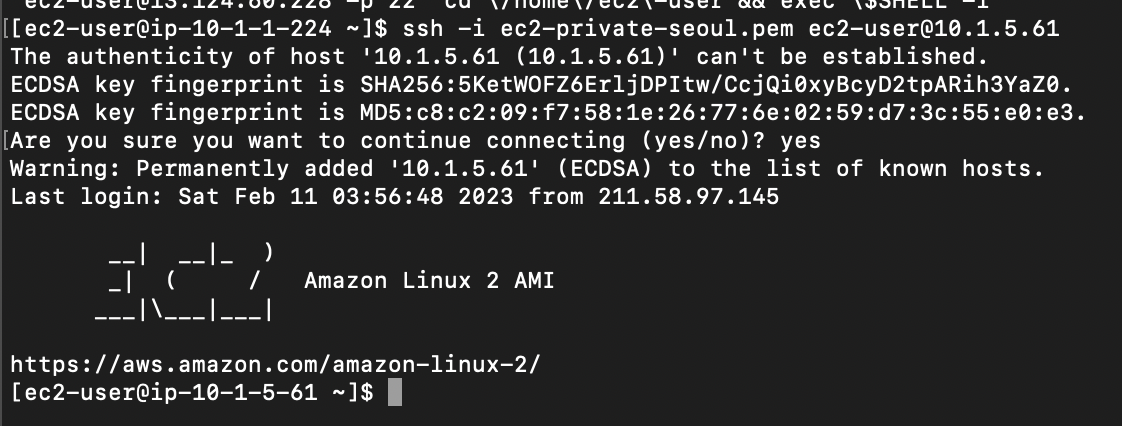 - public-ec2-a1을 통해서 private-ec2-a1에 접속하였다.