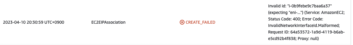 - 에러 메시지 : Invalid id: "i-0b9febe9c7baa6a37" (expecting "eni-...") (Service: AmazonEC2; Status Code: 400; Error Code: InvalidNetworkInterfaceId.Malformed; Request ID: 64a53572-1a9d-4119-b6ab-e5cd92b4f838; Proxy: null)
