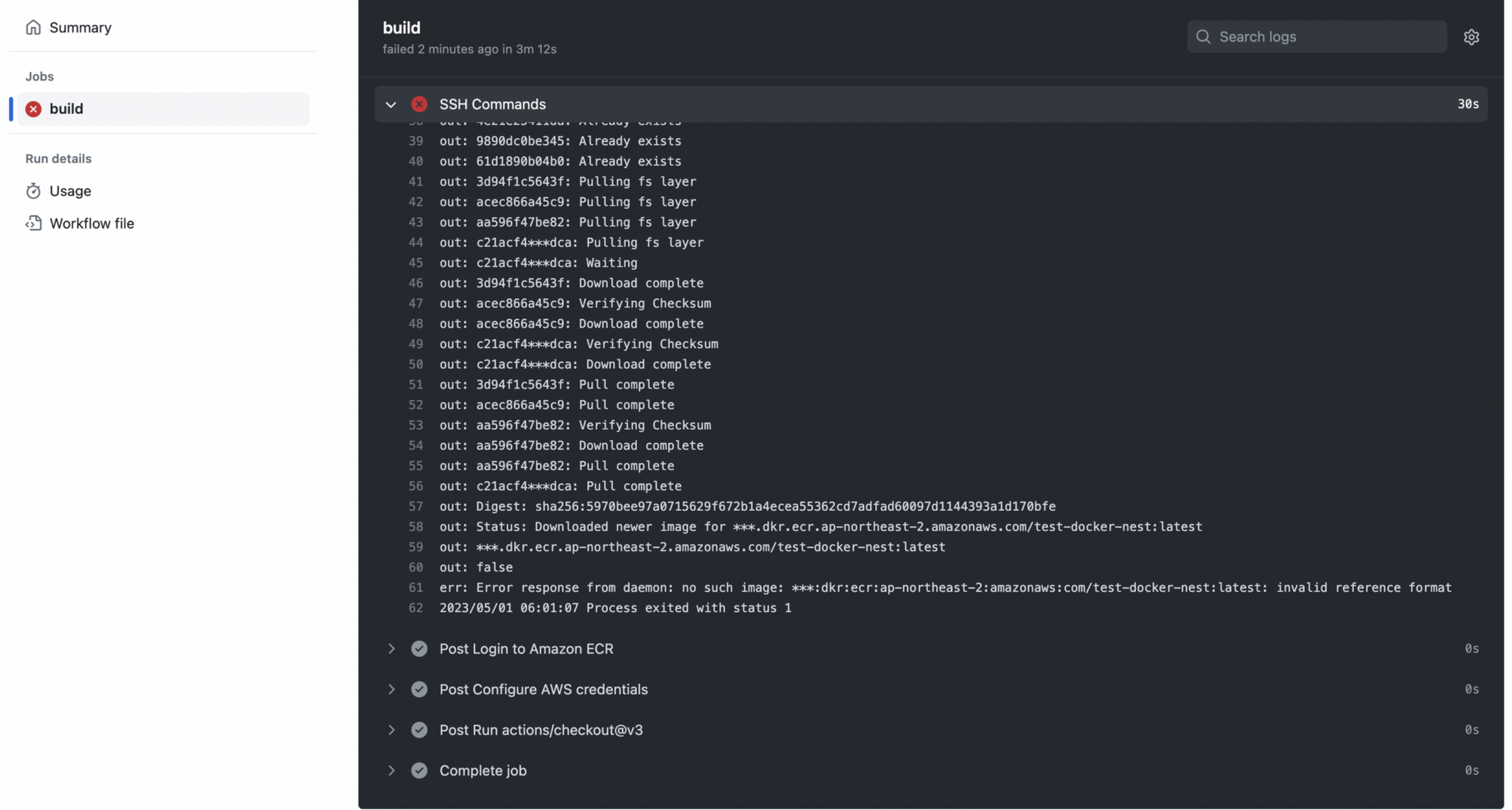 - 에러메시지 : err: Error response from daemon: no such image: ***:dkr:ecr:ap-northeast-2:amazonaws:com/test-docker-nest:latest: invalid reference format