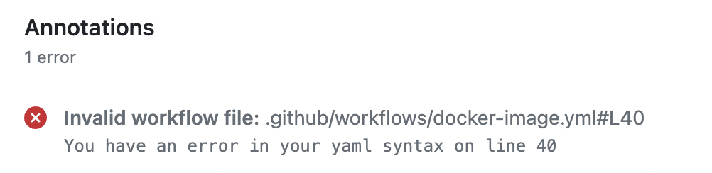 - 에러메시지 : Invalid workflow file: .github/workflows/docker-image.yml#L40