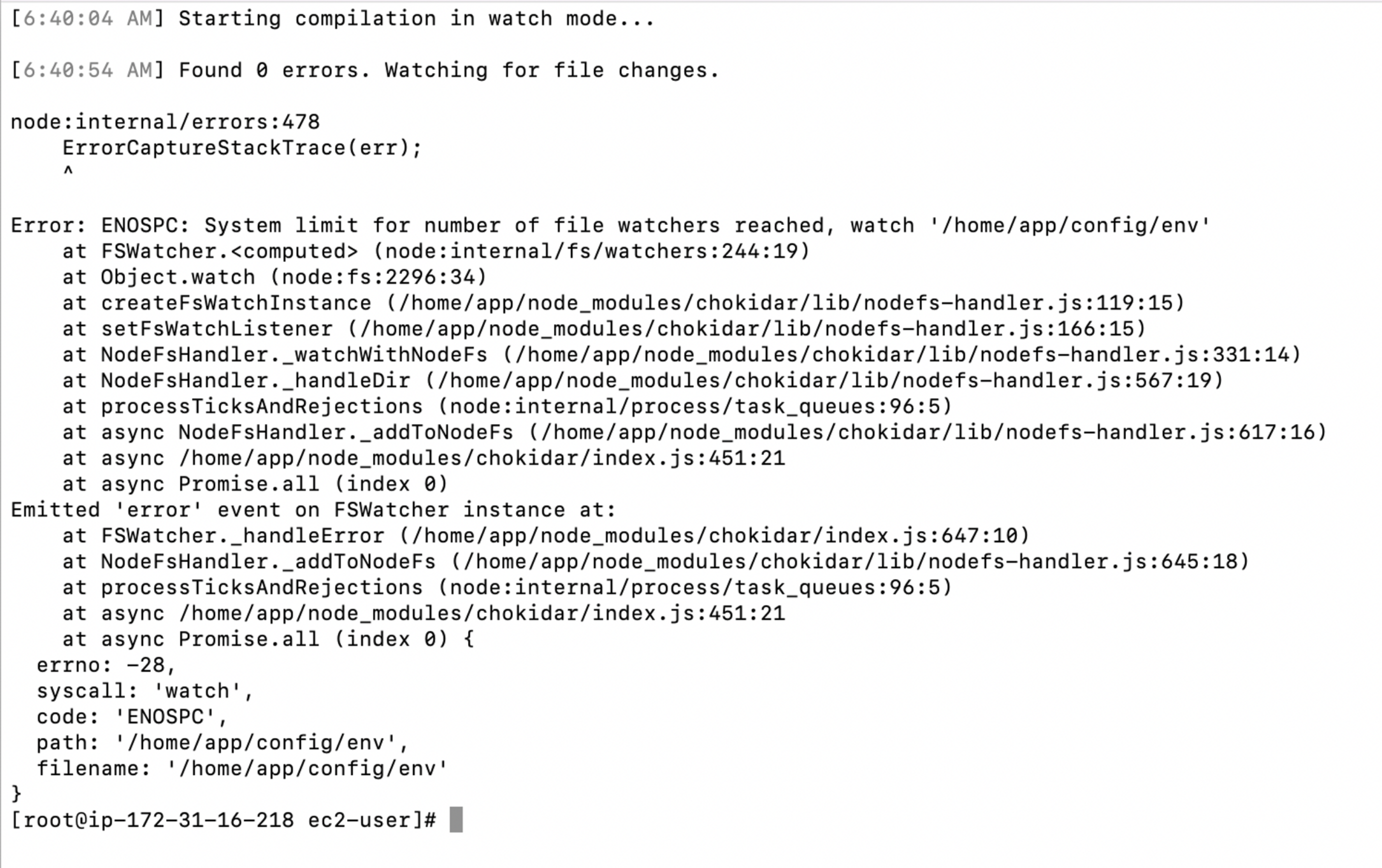 - echo fs.inotify.max_user_watches=524288 | sudo tee -a /etc/sysctl.conf && sudo sysctl -p 를 EC2 인스턴스의 터미널에서 실행시켜 watches의 max개수를 늘린다.