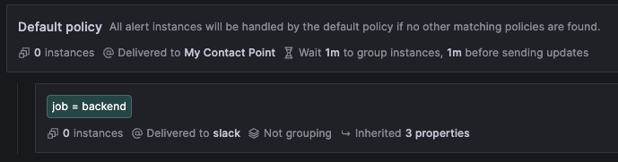 - Notification Policy 설정으로 default 경보는 default contact point 로 쏘게 하고 Spring Boot 에서 발생한 로그에서 쏴야하는 경보의 경우 slack contact point 로 쏘게 설정한다.