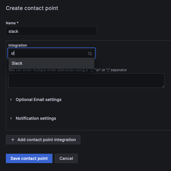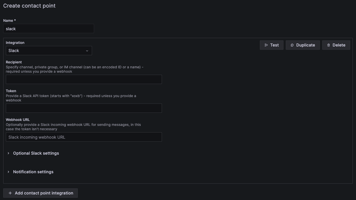 - 슬랙으로 경보를 쏴주어야 하기에 Slack Contact Point 를 만들어준다.